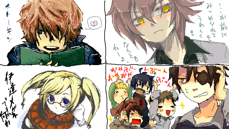 創作絵チャ。それぞれのもゆいモノをリクで描きましたオヒャァア!まえがみ(?)/スッミスミさん、ツンデレ/ゆーじんさん、眼鏡/せんのさん、親分子分/空灯