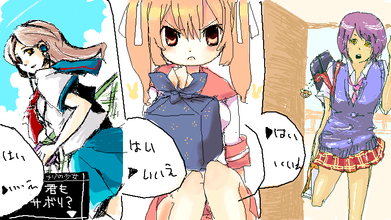 その後「ギャルゲを作ろう!」的なわけの分からない展開になって出来た産物。右から、サボり/せんのさん、手作り弁当/空灯、幼馴染/スッミスミさん